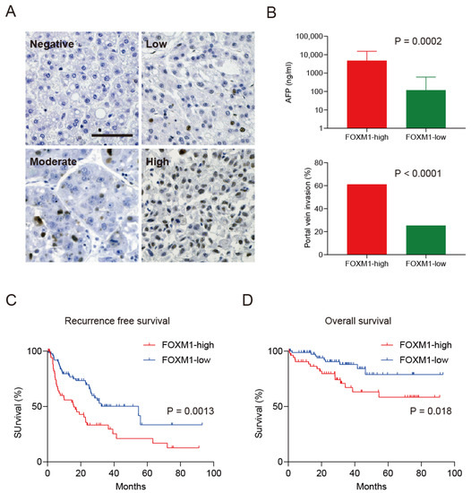 High FOXM1 expression is associated with poor prognosis in HCC patients (Cohort 1). (A) Representative immunohistochemistry images of FOXM1-negative (left upper panel), -low (right upper), -moderate (left lower), and -high HCC in surgically resected HCC tissue specimens (scale bar = 200 μm). (B) Serum AFP levels (upper panel) and frequency of microscopic portal vein invasion (lower panel) were higher in FOXM1-high HCC compared with FOXM1-low HCC (p = 0.0002, Mann–Whitney test for AFP, means ± SEM). (C) Kaplan–Meier survival analysis with the log-rank test of recurrence-free survival in FOXM1-high and -low HCC. Red, FOXM1-high (n = 54); blue, FOXM1-low (n = 79). (D) Kaplan–Meier survival analysis with the log-rank test of overall survival in FOXM1-high and -low HCC. Red, FOXM1-high (n = 54); blue, FOXM1-low (n = 79).