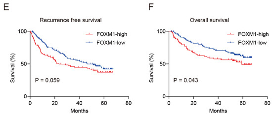 We evaluated the recurrence-free (Figure 2E) and overall (Figure 2F) survival of Cohort 2 HCC patients and found that FOXM1-high HCC patients showed worse recurrence-free (p = 0.059) and overall (p = 0.043) survival compared with FOXM1-low HCC patients.