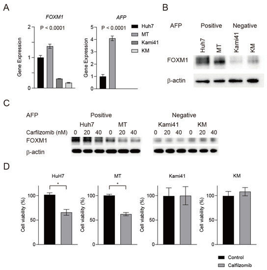 Carfilzomib inhibits FOXM1 protein expression in AFP-positive cells. (A) FOXM1 and AFP expression in Huh7, MT, Kami41, and KM cells (n = 3 in each group, means ± SEM, one-way ANOVA test). (B) Western blot analysis of FOXM1 in AFP-positive and -negative cells. (C) Western blot analysis of FOXM1 in AFP-positive and -negative cells treated with carfilzomib for 24 h. Experiments were performed twice. (D) Viability of Huh7, MT, Kami41, and KM cells treated with carfilzomib for 24 h (n = 3 in each group, means ± SEM, Student’s t-tests, * p < 0.05). Experiments were performed twice.
