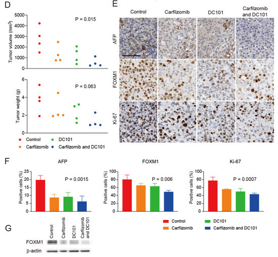 To evaluate the effect of carfilzomib on the progression of HCC, we utilized NOD/SCID mice for subcutaneous tumor xenotransplantation with Huh7 cells. When the tumor volume reached approximately 1000 mm3, these mice were defined as advanced HCC. We planned to evaluate the effect of DC101 (anti-mouse VEGFR2 antibody) on AFP-positive Huh7 cell growth given that recent studies clearly showed the efficacy of ramucirumab, an anti-human VEGFR2 monoclonal antibody, for the treatment of AFP-positive advanced HCC in humans [8,9]. We treated these mice with control IgG and vehicle, control IgG and carfilzomib, DC101 and vehicle, or DC101 and carfilzomib, according to the indicated schedule for 2 weeks (Figure 5A). We evaluated survival (n = 7 in each group) and tumor volume (n = 4 in each group) separately. In this condition, the combination of carfilzomib and DC101 prolonged the survival of mice compared with the control (p = 0.0072) (Figure 5A). Carfilzomib alone or DC101 alone also prolonged the survival compared with the control, with borderline significance (carfilzomib; p = 0.1, DC101; p = 0.07). The combination of carfilzomib and DC101 tended to prolong the survival of mice compared with single agents, but the difference did not reach statistical significance (carfilzomib; p = 0.14, DC101; p = 0.14). Besides, although carfilzomib treatment alone or DC101 treatment alone reduced tumor volume and weight, their combination suppressed tumor growth and weight in vivo (volumes; p = 0.015, weight; p = 0.063, by one-way ANOVA test) (Figure 5B–D). Interestingly, we found that only the combination of carfilzomib and DC101 treatment could reduce the tumor volumes compared with the control or carfilzomib/DC101 monotherapy (Figure 5C). Furthermore, carfilzomib treatment alone, DC101 treatment alone, and their combination reduced the number of AFP-positive, FOXM1-positive, or Ki-67-positive cells (Figure 5E,F, one-way ANOVA test). Western blot data confirmed the effect of carfilzomib, DC101, and their combination treatment on FOXM1 reduction (Figure 5G). Taken together, these data suggested the potential utility of treatment targeting microenvironmental VEGFR2 signaling with the blockade of FOXM1 for a better survival outcome in patients diagnosed with advanced-stage AFP-positive HCC.