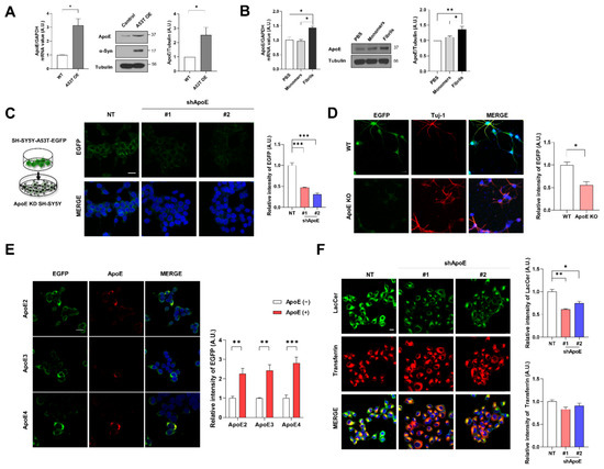 - Harris, F.M.; Tesseur, I.; Brecht, W.J.; Xu, Q.; Mullendorff, K.; Chang, S.; Wyss-Coray, T.; Mahley, R.W.; Huang, Y. Astroglial regulation of apolipoprotein E expression in neuronal cells. Implications for Alzheimer’s disease. J. Biol. Chem. 2004, 279, 3862–3868. [Google Scholar] [CrossRef]