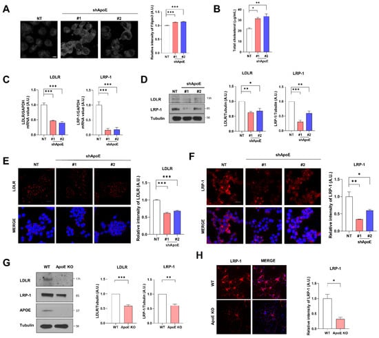 Cholesterol homeostasis is regulated by ApoE in cells through cholesterol transfer [36,37]. We measured intracellular cholesterol levels to investigate the role of neuronal ApoE in cellular cholesterol levels. Immunocytochemistry with filipin3, which stains cholesterol in cells [38,39], showed that intracellular cholesterol levels were increased in ApoE KD SH-SY5Y cells than in the control cells (Figure 2A). The total cellular cholesterol levels measured with ELISA showed a similar pattern (Figure 2B), suggesting that ApoE deficiency increases intracellular cholesterol levels in neurons. Intracellular cholesterol regulates the expression of ApoE receptors [40]. The mRNA and protein levels of LDLR and LRP-1 decreased in ApoE KD SH-SY5Y cells (Figure 2C,D). Immunocytochemistry for LDLR and LRP-1 showed similar results (Figure 2E,F). In primary neurons from ApoE KO mice, LDLR and LRP-1 levels were also decreased (Figure 2G,H), suggesting that ApoE KD increases intracellular cholesterol levels and further decreases ApoE receptors, such as LDLR and LRP-1, in neurons.