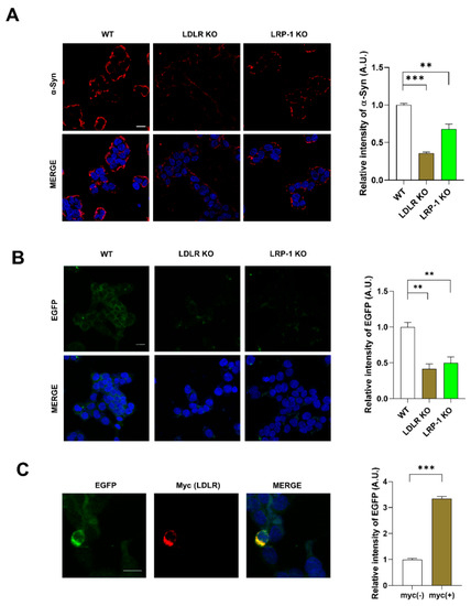 LDLR and LRP-1 expressed in SH-SY5Y cells function as receptors responsible for α-syn uptake. (A) LDLR KO and LRP-1 KO SH-SY5Y cells were treated with 1 μM α-syn fibrils for 30 min, and the cells were then fixed and immunostained with an anti-α-syn antibody. Values were derived from three independent experiments (n = 3). (B) LDLR KO and LRP-1 KO SH-SY5Y cells were co-cultured with differentiated A53T α-syn-EGFP OE SH-SY5Y cells for 24 h using a dual chamber. The cells were then fixed and immunostained with an anti-EGFP antibody. Values were derived from three independent experiments (n = 3) (C) SH-SY5Y cells were transfected with a plasmid for LDLR-myc. The cells were co-cultured with differentiated A53T α-syn-EGFP OE SH-SY5Y cells for 24 h using a dual chamber. The cells were then fixed and immunostained with anti-Myc and anti-EGFP antibodies. Values were derived from three independent experiments (n = 3). ** p < 0.01, *** p < 0.001 against the control; one-way ANOVA or unpaired t-tests. Blue indicates DAPI staining. Scale bars indicate 20 μm.