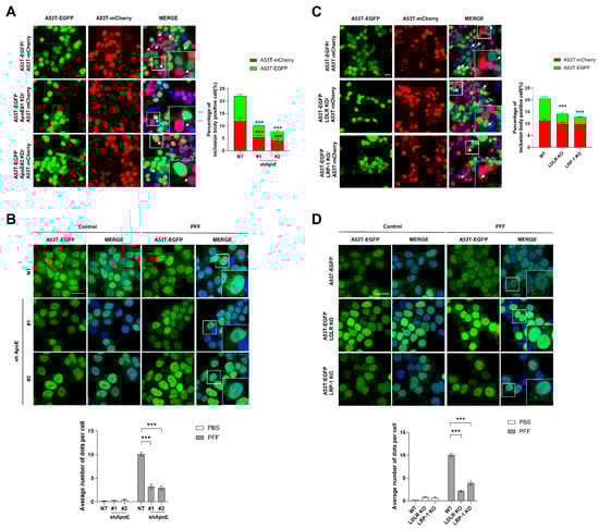To further explore whether neuronal ApoE regulates α-syn propagation, we generated stable cell lines OE A53T α-syn-EGFP in ApoE-KD SH-SY5Y cells (Figure S1D). Then, a coculture assay, described in a previous study that explored whether cell-derived α-syn can induce inclusion body formation with endogenous α-syn expressed in neurons by measuring double fluorescence-labeled aggregation puncta [33], was performed. When ApoE KD/A53T α-syn-EGFP OE SH-SY5Y cells were cocultured with A53T α-syn-mCherry OE SH-SY5Y cells, double fluorescence-labeled aggregation puncta in ApoE KD/A53T α-syn-EGFP OE SH-SY5Y cells were efficiently suppressed. Interestingly, double fluorescence-labeled aggregation puncta in A53T α-syn-mCherry OE SH-SY5Y cells were also suppressed (Figure 4A), suggesting that the release of α-syn from ApoE KD/A53T α-syn-EGFP OE SH-SY5Y cells may also be decreased. Treatment with recombinant α-syn fibrils induces intracellular α-syn aggregation [41,42,43]. When A53T α-syn-EGFP OE SH-SY5Y cells were treated with α-syn fibrils, the aggregation of A53T α-syn-EGFP was observed. In ApoE KD SH-SY5Y cells, fewer aggregation puncta were observed (Figure 4B), which supports the results of the co-culture assay. In LDLR and LRP-1 KO cells, aggregation puncta were efficiently suppressed in LDLR and LRP-1 KO/A53T α-syn-EGFP OE SH-SY5Y cells, but not in A53T α-syn-mCherry OE SH-SY5Y cells (Figure 4C). Fewer aggregation puncta in LDLR and LRP-1 KO/A53T α-syn-EGFP OE SH-SY5Y cells were also observed after the treatment with α-syn fibrils (Figure 4D). These results suggest that ApoE and ApoE receptors may be differentially involved in α-syn propagation in SH-SY5Y cells.