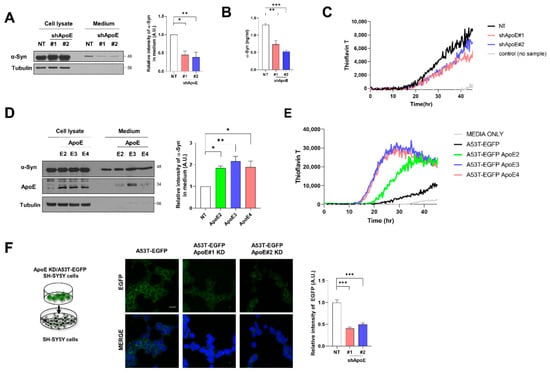 To explore whether ApoE affects α-syn release from neurons, we measured the released α-syn in the culture media. As shown in Figure 5A, on Western blotting, α-syn was less abundant in the culture media from ApoE KD/A53T α-syn-EGFP OE SH-SY5Y cells than in the media from A53T α-syn-EGFP OE SH-SY5Y cells. This was also confirmed by ELISA (Figure 5B). Furthermore, α-syn is released in both monomeric and aggregated forms [8]. Extracellular α-syn aggregates are responsible for the intracellular aggregation of endogenous α-syn as a seed [44]. Recently, an α-syn real-time quaking-induced conversion (RT-QUIC) analysis was developed to detect α-syn aggregates in various biological samples [45]. We performed such α-syn RT-QUIC analysis to detect α-syn fibrils as seeds in culture media. As shown in Figure 5C, α-syn fibrils were detected in the culture media of both cell lines. However, fewer responses were detected in the culture medium of ApoE KD/A53T α-syn-EGFP OE SH-SY5Y cells. In contrast, the overexpression of ApoE isoforms in A53T α-syn-EGFP SHSY5Y cells induced a greater release of α-syn from cells (Figure 5D). Our α-syn RT-QUIC analysis also showed a greater response in the culture media from A53T α-syn-EGFP SHSY5Y cells OE ApoE isoforms (Figure 5E). Additionally, a dual-chamber assay was performed using ApoE KD/A53T α-syn-EGFP OE SH-SY5Y cells as donor cells and the control SH-SY5Y cells as recipient cells. Reduced levels of A53T α-syn-EGFP were detected in SH-SY5Y cells with ApoE KD/A53T α-syn-EGFP OE SH-SY5Y cells than in A53T α-syn-EGFP OE SH-SY5Y cells in the upper chamber (Figure 5F), suggesting that ApoE also regulates α-syn release from SH-SY5Y cells.