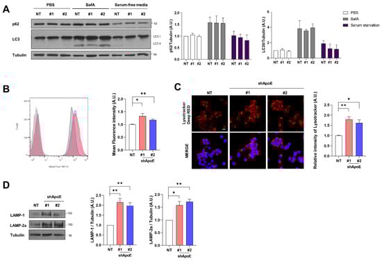 ApoE deficiency enhances chaperone-mediated autophagy in SH-SY5Y cells. (A) NT and ApoE KD #1, #2/A53T α-syn-EGFP OE SH-SY5Y cells were treated with 100 nM bafilomycin A1 for 24 h or cultured in serum-free media for 24 h. The cells were then lysed with RIPA buffer and samples were analyzed by Western blot. Values were derived from three independent experiments (n = 3). (B) The cells were incubated with 50 nM lysotracker for 30 min and then analyzed by flow cytometry. Dotted lines indicate values from samples without lysotracker treatment. Values were derived from three independent experiments (n = 3). (C) The cells were treated with 50 nM lysotracker for 30 min and their intensity was analyzed by confocal microscopy. Values were derived from three independent experiments (n = 3). (D) The cells were lysed with RIPA buffer and analyzed by Western blot. Values were derived from three independent experiments (n = 3). * p < 0.05, ** p < 0.01 against the control; one-way ANOVA. Blue indicates DAPI staining. Scale bar indicates 20 μm.