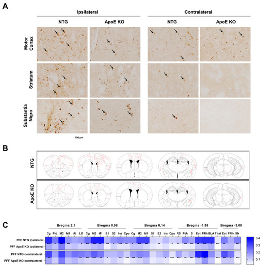 The stereotaxic injection of preformed mouse α-syn fibrils has been reported to accelerate the formation of intracellular LB- and LN-like inclusions in young wild-type (WT) mice, which represents a useful animal model for the elucidation of the prion-like propagation of α-syn [51]. We injected mouse α-syn fibrils into the unilateral striatum of 8-week-old WT and ApoE KO mice. As shown in Figure 7, Figures S2 and S3, α-syn lesions were detected in the brain by immunohistochemistry of pSer129 α-syn, a marker of pathological α-syn [52] at 90 days post-injection, which was consistent with a previous study [51]. However, the propagation of α-syn lesions was diminished in the brains of ApoE KO mice compared to WT mice (Figure 7), suggesting that ApoE regulates the propagation of α-syn in vivo.