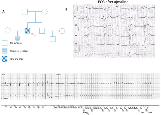 Clinical characteristics of the BrS patient. (A) The pedigree of the BrS patient’s family. The patient recruited for this study is marked by the arrow. He has had sudden cardiac death. (B) The electrocardiogram (ECG) from the BrS patient shows a classic BrS–ECG pattern after infusion of ajmaline. (C) Electrocardiogram of the ICD showing ventricular fibrillation terminated with an appropriate ICD shock after stopping the bisoprolol treatment.