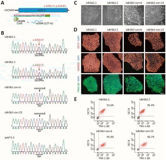 We generated hiPSCs from skin fibroblasts of the patient with BrS carrying the variant (c.425C > T/p.S142F) in the CACNB2 gene. Then, we used the CRISPR/Cas9-based genome editing to correct the CACNB2 variant in the generated hiPSCs (Figure 2A,B). Two patient-specific and two CRISPR/Cas9-corrected hiPSC lines were selected and verified for pluripotency and normal karyotype (Figure 2C–E, Figure S1). Three healthy hiPS cell lines, which have been characterized before, were used in the current study. Data from all the healthy cells were combined as healthy controls.