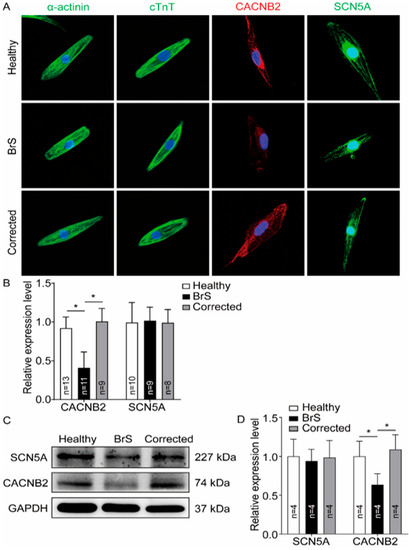 Reduction of CACNB2 protein expression level in hiPSC-CMs from the BrS-patient. Western blot and immunostaining analyses were performed to examine the protein levels of CACNB2 in hiPSC-CMs from healthy donor (Healthy), the patient (BrS) and isogenic control cell line (Corrected). (A) Representative immunostaining images. (B) Statistical analyses of fluorescence intensity from immunostained cells. (C) Representative examples of Western blots of cell lysates from healthy donor cell line (healthy), the patient (BrS) and the CRISPR/Cas9-corrected (Corrected) hiPSC-CMs. (D) Statistical analyses of relative expression levels of SCN5A and CACNB2 from Western blot experiments. Data were shown as mean ± standard deviation (SD). Numbers given represent the number of cells (B) or experiments (D). * p < 0.05 versus healthy analyzed by one-way analysis of variance (ANOVA) with Holm–Sidak post-test.