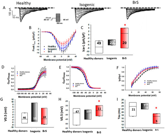 Reduction of L-type calcium channel currents in hiPSC-CMs from the BrS patient. Peak L-type calcium (ICa-L) and sodium channel (INa) currents were analyzed in hiPSC-CMs from healthy donors (Healthy), the BrS patient (BrS) and variant-corrected cells (Isogenic). (A) Representative traces of ICa-L in hiPSC-CMs from healthy donors (Healthy), the BrS patient (BrS) and variant-corrected cells (Isogenic). (B) I-V curves of ICa-L from healthy donors (Healthy), the BrS patient (BrS) and variant-corrected cells (Isogenic). (C) Median values of peak ICa-L at −10 mV from healthy donors (Healthy), the BrS patient (BrS) and variant-corrected cells (Isogenic). (D) Activation curves of ICa-L in hiPSC-CMs from each cell line. (E) Inactivation curves of ICa-L in hiPSC-CMs from each cell line. (F) Recovery curves of ICa-L in hiPSC-CMs from each cell line. (G) Median values of the potential at 50% activation (V0.5) of ICa-L in hiPSC-CMs from each cell line. (H) Median values of the potential at 50% inactivation (V0.5) of ICa-L in hiPSC-CMs from each cell line. (I) Median values of the time constants (Tau) of recovery from the inactivation of ICa-L in hiPSC-CMs from each cell line. Numbers given in (C) represent the number of cells for (B,C). Numbers given in (F) represent the number of cells for (E,F). * p < 0.05 versus Healthy according to the analysis of one-way ANOVA with Holm–Sidak post-test.