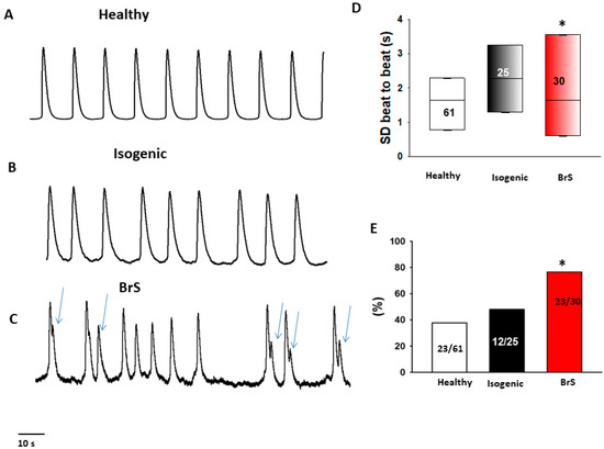 Increased beating variability and arrhythmic events in BrS-hiPSC-CMs. Spontaneous calcium transients were recorded in spontaneously beating hiPSC-CMs from the BrS patient, the healthy donor (healthy) and the CRISPR-corrected cells (isogenic). The beating variability (standard deviation (SD) of cell beating intervals) and the occurrence of arrhythmic events (irregular or triggered beats or EAD-like events) were compared among the three cell groups. (A–C) Representative traces of calcium transients in cells from each line. Arrhythmic events are marked by arrows. (D) Median values of standard deviation (SD) of cell beating intervals. (E) Percentage of cells showing arrhythmic events. The numbers given represent number of cells showing arrhythmic events versus total cell number. The numbers given represent number of cells. * p < 0.05 versus healthy according to the one-way ANOVA (D) or Fisher’s exact test (E).
