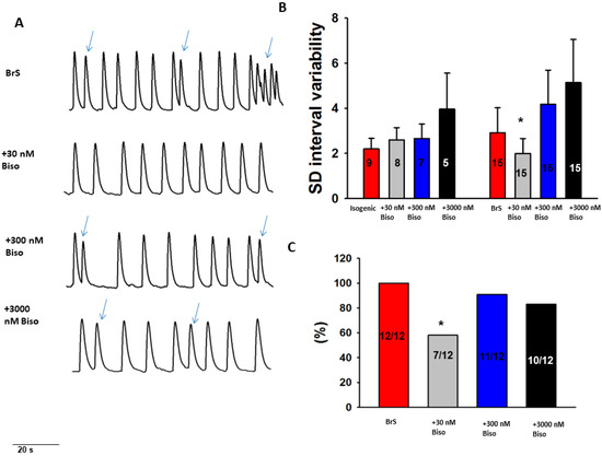 Effects of beta-blocker on the beating variability and arrhythmic events in BrS-hiPSC-CMs. Spontaneous calcium transients were recorded in regularly beating hiPSC-CMs from the BrS patient and the isogenic control(isogenic) in the absence (baseline) and presence of 30 nM, 300 nM and 3000 nM bisoprolol (Biso). The beating variability (standard deviation (SD) of cell beating intervals) and the occurrence of arrhythmic events (irregular or triggered beats or EAD-like events) were compared between with and without drug application. (A) Representative trace of BrS (at baseline) and after the administration of different concentrations of bisoprolol. (B) Mean values of standard deviation (SD) of cell beating intervals. (C) Percentage of cells showing arrhythmic events. * p < 0.05 versus isogenic according to Fisher’s exact test (C) or versus baseline according to t-test (B).