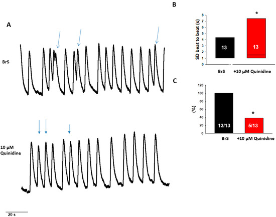 Effects of quinidine on the beating variability and arrhythmic events in BrS-hiPSC-CMs. (A) Representative traces of calcium transient before and after administration of 10 µM quinidine in BrS-hiPSC-CMs. Only cells with arrhythmic events were used. (B) Median values of standard deviation (SD) of cell beating intervals. (C) Percentage of cells showing arrhythmic events. * p < 0.05 using Fisher’s exact test (C) or versus baseline according to t-test (B).