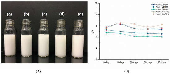 (A) Macroscopic view of the Nano_Control polymeric nanocapsule formulations: (a) Nano_Control; (b) Nano_GER1%—Nanocapsules containing 1% of geraniol; (c) Nano_GER3%—Nanocapsules containing 3% of geraniol; (d) Nano_ICAR1%—Nanocapsules containing 1% icaridin and (e) Nano_ICAR3%—Nanocapsules containing 3% icaridin. (B) pH profile of PCL polymeric nanocapsules containing geraniol and icaridin (0, 15, 30, 60 days, and 90 days). Measurements were performed in triplicate (n = 3).