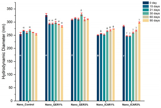 Hydrodynamic diameter (size) of polymeric nanocapsules containing geraniol and icaridin as a function of time (90 days). Measurements were performed in triplicate (n = 3); these values represent the mean of the three determinations. Considered significance of p < 0.05 (one-way ANOVA—Tukey) for the analysis of variance of times (15, 21, 30, 60, and 90 days) in relation to time 0. Equal symbols (α, σ, δ, Φ and γ) represent significant variation.