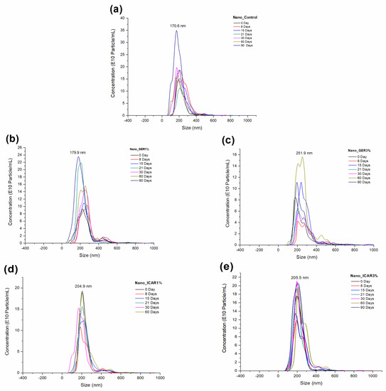 Particle size distribution as a function of concentration and time (0, 8, 15, 21, 30, 60, and 90 days) of the formulations (a) Nano_Control, (b) Nano_GER1%, (c) Nano_GER3%, (d) Nano_ICAR1%, and (e) Nano_ICAR3% using Nanoparticle Tracking Analysis (NTA).