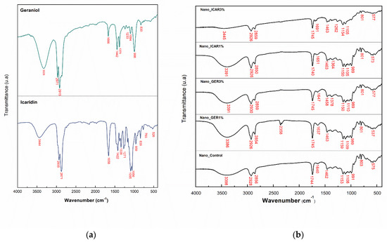 (a) Infrared spectra for the bioactives geraniol and icaridin and (b) infrared spectra for the formulations Nano_Control, Nano _GER1%, Nano_GER3%; Nano_ICAR1%, and Nano _ICAR3%. The spectra were obtained through Fourier transform infrared spectroscopy (FTIR) using KBr, in the frequency range from 4000 to 400 cm−1.