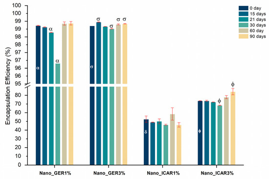 Encapsulation efficiency (%) of polymeric nanocapsules as a function of time (0, 15, 21, 30, 60, and 90 days). Measurements were performed in triplicate (n = 3); these values represent the mean of the three determinations. Considered significance of p < 0.05 (one-way ANOVA—Tukey) for the analysis of variance of times (15, 21, 30, 60, and 90 days) in relation to time 0. Equal symbols (α, σ, δ and Φ) represent significant variation.