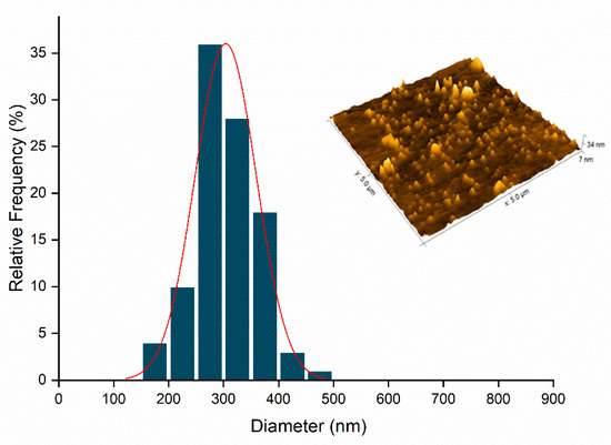 Figure 8 shows the results obtained by AFM analysis for Nano_Ger3%, displaying spherical structure and a homogeneous size of approximately 198 nm. These data corroborate the PDI values determined by DLS, although there is a difference in the size of the nanocapsules compared to the diameter analyzed by DLS. This can be attributed to several factors such as aggregation or flattening of the nanocapsules when they are deposited and dried on the mica surface, giving rise to heterogeneous populations [41,42].