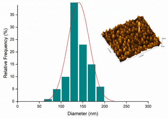 Figure 9 shows that the nanocapsules in the Nano_ICAR3% formulation are also spherical, homogeneously distributed, and have an average size of approximately 148 nm. The difference in the diameters of the nanocapsules as analyzed by DLS and AFM can be attributed to several factors, such as aggregation or flattening of the nanocapsules when they are deposited and dried on the mica surface, thus giving rise to heterogeneous populations [42].