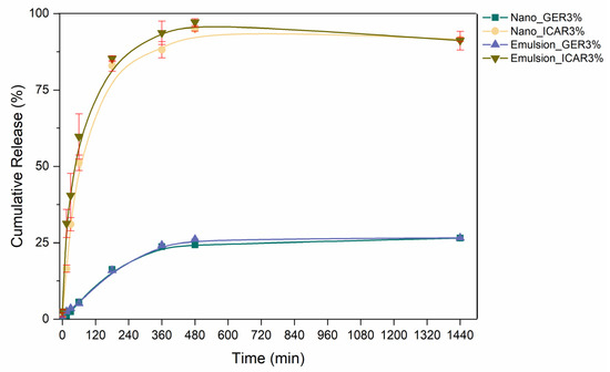 The graph shows cumulative release curves (%) of Nano_GER3% nanocapsules: Nano_ICAR3%, Emulsion_GER3%, and Emulsion_ICAR3% were carried out at a temperature of 32 °C. The analyses were performed in triplicate (n = 3) and quantification by high-performance liquid chromatography (HPLC).