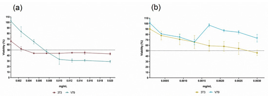 Queiroz et al. [48] evaluated the cytotoxicity of geraniol using the MTT method in human hepatocyte (HepG2) cells and showed a decrease in cell viability of less than 70% at a concentration of 25 µg/mL (0.025 mg/mL). This result could be related to the inhibitory effect of geraniol (50 and 200 µM) on the mevalonate pathway and phosphatidylcholine biosynthesis. The cell viability results of the 3T3 and V79 cell lines against the Nano_GER3%/ICA3% formulation after exposure for 24 h showed that the 3T3 cell line, initially at the lowest concentration, presented a viability of 66%. In contrast, there was a 50% viability at a concentration of 0.0025 mg/mL and a viability of 43% at a concentration of 0.02 mg/mL. For the V79 strain, 100% and 65% cell viability were obtained at concentrations of 0.0005 and 0.005 mg/mL, respectively. However, unlike the 3T3 strain, 50% viability was reached at 0.0075 mg/ mL (Figure 12b).