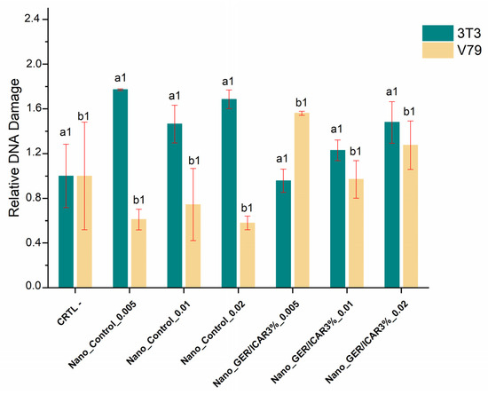 DNA damage assessment by the comet assay in cell lines: 3T3 and V79 exposed to concentrations of 0.005; 0.01, and 0.02 mg/mL of the formulations Nano_GER/ICAR3% and Nano_S/Active. Equal numbers (a1, b1) are not statistically significant (p > 0.05).