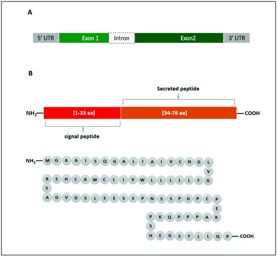 In human, the Enho gene is in chromosome number 9 (9p13.3), position 34,521,043–34,522,990 and it has a size of 1948 bp. It is composed of two exons and one intron (Figure 1A). Adropin, which is encoded by the Enho gene, is 76 amino acids in length (MGAAISQGALIAIVCNGLVGFLLLLLWVILCWACHSRSADVDSLSESSPNSSPGPCPEKAPPPQKPSHEGSYLLQP) and has a molecular weight of 4.499 KDa (Figure 1B). The amino acid sequence is 100% conserved in human, mouse and rat. Adropin1−33 (amino acids 1–33) is a secretory signal peptide [], and adropin34−76 (amino acids 34–76) is biologically active when it is administered to rats [].