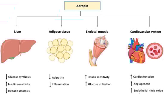 On the other hand, it was reported that adropin downregulated the proliferation and migration of human aortic smooth muscle cells (HASMCs) in vitro, providing evidence that the peptide is also protective against atherosclerosis [] (Table 1). The role of adropin in different tissues and organ systems is depicted in Figure 2.