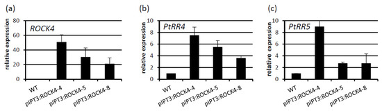 At first we explored the usefulness of the ROCK4 gene, which encodes a more active variant of the Arabidopsis cytokinin biosynthesis gene IPT3. IPT3 is involved in regulating cambial activity in Arabidopsis [7]. ROCK4 was positioned under control of the Arabidopsis IPT3 gene promoter (pIPT3:ROCK4), which is principally active in phloem cells [27]. Among the eight primary transformants, three independent lines expressing ROCK4 were identified and selected for further analysis (Figure 1a). The expression level of two cytokinin-responsive poplar ARR genes, PtRR4 and PtRR5 [13], were used as an indicator of the cytokinin status. qPCR analysis showed an approximately 4–8-fold higher mRNA level of PtRR4 and an approximately 2–8-fold increase of PtRR5, indicating an increased cytokinin signaling output (Figure 1b,c). The differences in the relative increase of expression of RRA genes in the three lines reflected the differences in transgene expression.