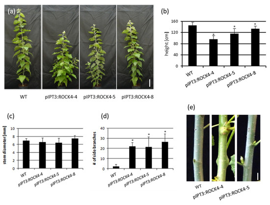 Phenotypical characterization of pIPT3:ROCK4 transgenic poplar plants grown in a greenhouse. (a) Phenotype of 12-week-old wild type (WT) and pIPT33:ROCK4 plants. Bar size = 20 cm. (b) Plant height, (c) stem diameter 20 cm above ground and (d) number of side branches of 12-week-old plants. Data shown are mean values ± SD (n = 9–13). (e) Stems with axillary buds and side branches, leaves were removed. Bar size = 5 mm. Statistical significance of differences to wild type were calculated using Student’s t-test. *, p < 0.05.