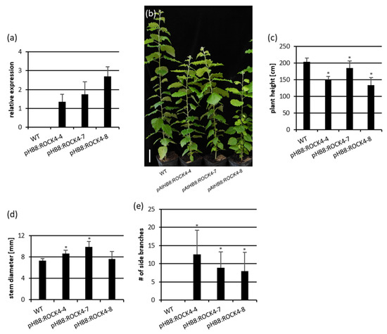 Characterization of pHB8:ROCK4 transgenic poplar plants grown in vitro and in a greenhouse. (a) Relative expression of pHB8:ROCK4 in stem tissue of plants grown in vitro. Samples were harvested four weeks after subcultivation. (b) Phenotype of 17-week-old WT and pHB8:ROCK4 plants grown in a greenhouse. Bar size = 20 cm. (c) Plant height, (d) stem diameter and (e) number of side branches of 36-week-old poplar plants. Data shown are mean values ± SD (n ≥ 8). Statistical significance of differences to wild type were calculated using Student’s t-test. *, p < 0.05.