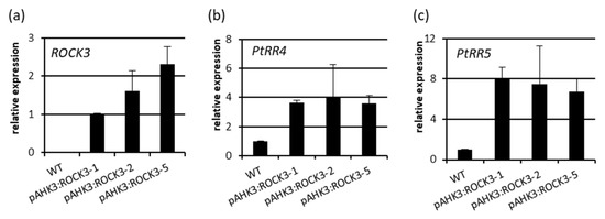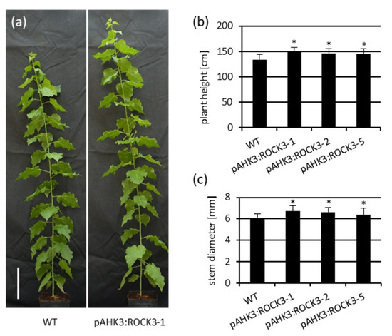Thirteen weeks after their transfer to the green house, plants of all three independent pAHK3:ROCK3 transgenic lines showed a significantly increased plant height of about 10% in comparison to wild-type poplars (Figure 6a,b). The stem diameter of the pAHK3:ROCK3 lines was also increased as compared to wild type (Figure 6c). pAHK3:ROCK3 plants did not show the formation of additional branches or increased growth of lateral buds (Figure 6a).