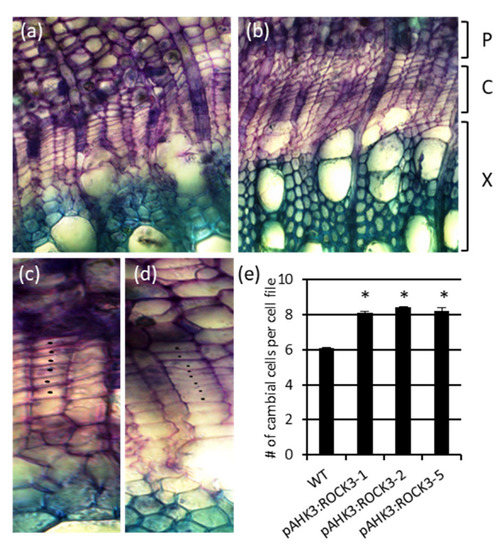 The analysis of stem cross-sections revealed a significantly increased number of cambial cells in all pAHK3:ROCK3 transgenic lines compared to wild-type plants (Figure 7a–d). Wild-type plants had about six cambial cells per cell file while all three transgenic lines had a significant difference of about eight cells per cell file taken at the same stem position (Figure 7e). This shows the retarded differentiation of secondary vascular tissue in the radial direction.