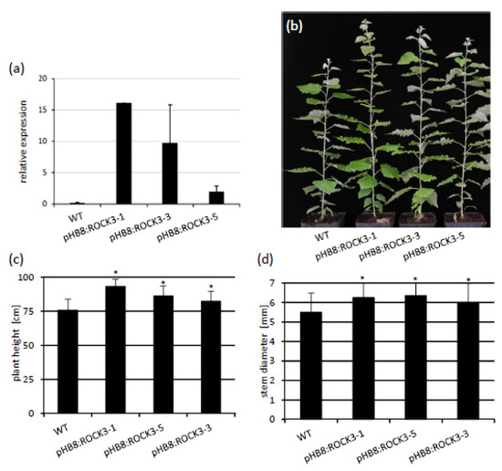 Characterization of pHB8:ROCK3 transgenic plants grown in vitro and in a greenhouse. (a) Relative expression of ROCK3 in stem tissue of poplar plants grown in vitro. Samples were taken four weeks after subcultivation. (b) Phenotype of 15-week-old WT and pHB8:ROCK3 plants grown in a greenhouse. (c) Height and (d) stem diameter of 15-week-old poplar plants. Data shown are mean values ± SD (n = 15). Statistical significance of differences to WT were calculated using Student´s t-test. *, p < 0.05.