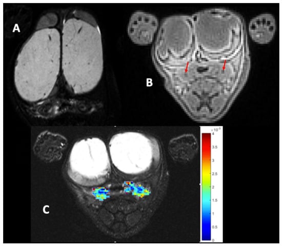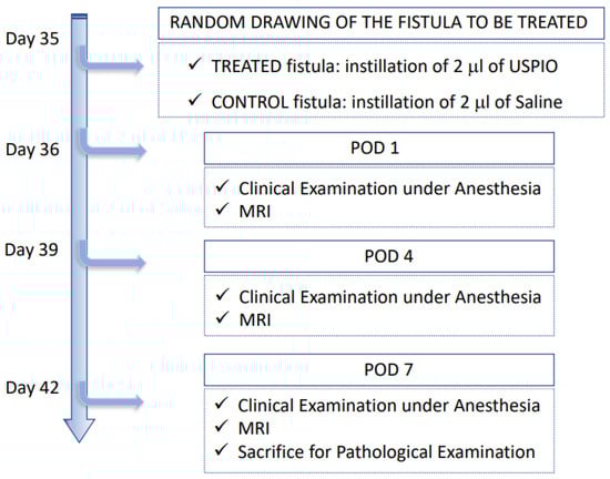 The follow-up after treatment is summarized in Figure 8. The rats were assessed at POD 1, POD 4, and POD 7. For each assessment, the rats were clinically examined under general anesthesia and underwent a perineal MRI.