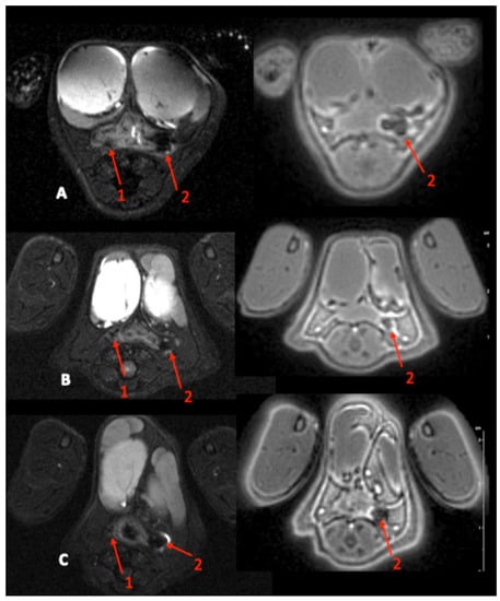 MRI images at POD 1 (A), POD 4 (B), and POD 7 (C). Left: T2-weighted image axial section. Right: axial ultra-short echo time (UTE) image. Red arrows 1: control fistula. Red arrows 2: fistula treated with USPIO (on the T2-weighted images, note the presence of an MRI hyposignal due to the iron nanoparticles present in the tract).