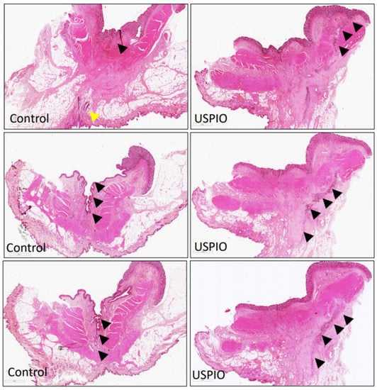 Histological characteristics of the control and USPIO-treated fistulas: representatives H&E-stained serial slices showing control (left panels) and USPIO-treated (right panels) specimens (magnification ×100). The control fistula lumen was visible with internal (black arrowhead—digestive side) and external (yellow arrowhead—perineal skin) orifices. There were local inflammatory signs of suppurative inflammation with abscess formation around the epithelialized fistula. The USPIO-treated transphincteric fistula was closed on its entire length (black arrowheads—revealed by black staining in the H&E section). Note that the internal orifice was no longer visible.
