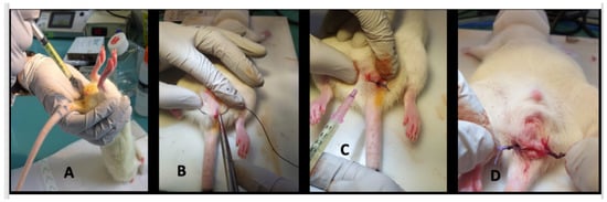 All the procedures were performed according to the same anesthetic and analgesic protocol. The animals were anaesthetized with isoflurane inhalation (isoflurane 3 L/min + O2 2 L/min during induction, then isoflurane 1.5 L/min + O2 2 L/min). Analgesia was performed by local injection of 20% lidocaine hydrochloride (1 mg/kg) and by subcutaneous abdominal injection of buprenorphine (0.05 mg/kg/rat). Post-operatively, if the animal showed any signs of pain-related stress, buprenorphine was administrated at the same dose.