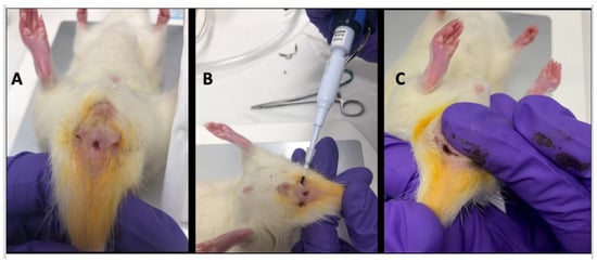 - day 7, fistula formation: at the peak of the rectal inflammation, 2 fistulas were created on each rat. The rats were placed in a supine position and this position was the reference to locate the fistulas (scrotum at 12 o’clock, tail at 6 o’clock). As shown in Figure 5B–D, the fistulas were created at 3 o’clock and 9 o’clock by inserting a surgical suture (Vicryl® 1, Ethicon Laboratory) through the rectum (internal orifice) and exiting at the perineum about 1 cm from the anal margin (external orifice). In order to obtain a good caliber, the fistula tract was sharpened with the surgical suture. An 18 G blunt fill needle was passed through the fistula as well as a 10 µL filter tip. We obtained internal and external orifices of approximately 2 mm in diameter. At the end of the surgical procedure, the thread was retained in the fistula tract and 100 µL of a TNBS solution was instilled within each tract (Figure 5C). The TNBS solution contained, for a 100 µL instillation, 17.06 µL of TNBS (i.e., 5 mg), 50 µL of pure ethanol, and 32.94 µL of saline solution. This concentration was identical to the rectal enema used for proctitis induction.
