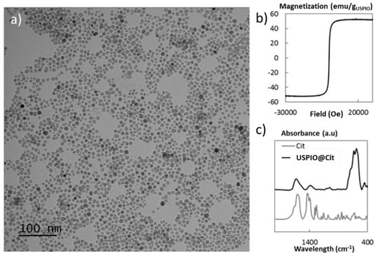 Physico-chemical characterizations of the citrated USPIO nanoparticles: (a) TEM image of the citrated USPIO nanoparticles of 9.0 ± 2.2 nm; (b) magnetization curve of the citrated USPIO nanoparticles at room temperature; and (c) FTIR spectra of the coated USPIO nanoparticles (USPIO@Cit) and the corresponding coating molecule (Cit).