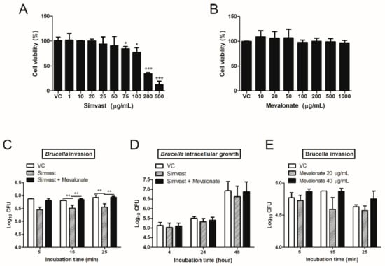 2.1. Simvastatin Inhibits Internalization of B. abortus into RAW 264.7 but Not Intracellular Growth