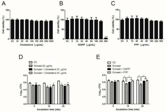 The 3-(4,5-dimethylthiazol-2yl)-2,5-diphenyl-2H-tetrazolium bromide (MTT) assay showed that cholesterol and FPP treatment had no cytotoxic effect on RAW 264.7 cell viability at all tested concentrations (Figure 3A,C). On the other hand, GGPP significantly decreased cell survivability at 48 h post-incubation with 500 µg/mL, while all the tested concentrations did not display cytotoxicity in cells (Figure 3B). Afterward, to investigate whether simvastatin-reduced cholesterol biosynthesis regulated bacterial internalization, we co-treated the cells with simvastatin (20 µg/mL) and cholesterol (20 or 50 µg/mL) at the same time. The supplementation of exogenous cholesterol did not affect the recovery in simvastatin-mediated decreases of the number of invaded bacteria (Figure 3D). By contrast, the supplement of GGPP (80 µg/mL) or FPP (80 µg/mL) at the same time with simvastatin treatment significantly increased the invasion of Brucella into RAW 264.7 cells (Figure 3E). This observation indicated that the inhibition in Brucella invasion was not dependent on cholesterol synthesis but regulated via intermediate products of the mevalonate pathway that are FPP and GGPP synthesis.