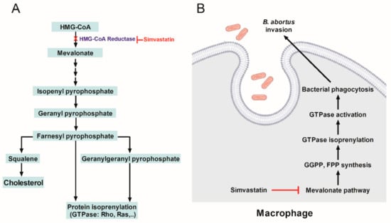 Schematic of mevalonic pathway and illustration of the inhibition effect of simvastatin on Brucella invasion through suppression of mevalonate pathway. Simvastatin inhibits the conversion of HMG-CoA to mevalonate, leading to the inhibition of GGPP and FPP synthesis, which regulates the prenylation of some GTPase such as Ras and Rho families (A). Inhibiting GTPase synthesis caused by simvastatin treatment affects the activation of GTPase lead to the reduced B. abortus internalization into RAW 264.7 cells (B). Abbreviations: HMG-CoA: 3-hydroxy-3-methylglutaryl coenzyme A; FPP: farnesyl pyrophosphate; GGPP: geranylgeranyl pyrophosphate.