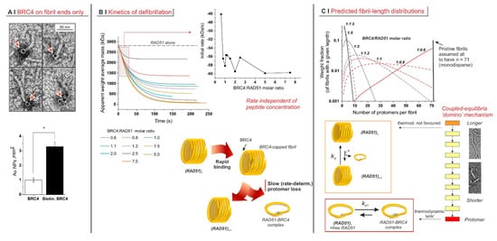 (A) Localization of biotinylated BRC4 peptide by avidin–gold labelling. The histogram below shows the different densities of gold nanoparticles when nonlabelled BRC4 or biotinylated BRC4 was used. The asterisk indicates a statistically significant difference (two-tailed Student’s t-test * p < 0.01). The labelled peptide was predominantly localized at only one of the fibril termini (23%, n = 67). In the remaining cases, it appeared to be bound to isolated RAD51 monomers (73%, n = 67). In the pictorial representation of RAD51 (below), its protomer was assumed to adopt a helical morphology, as evidenced by TEM images, and the fibrils were assumed to comprise aligned helices. (B) recorded as a function of time on RAD51/BRC4 suspensions ([RAD51] = 6.25 µM = 0.25 mg/mL) with various peptide/protein ratios. The data were fitted with an exponential function. The initial decrease rate, recorded as a function of the BRC4/RAD51 molar ratio (inset), was obtained as the derivative of the function at time zero. (C) Simulated weight distribution of RAD51 fibrils with different lengths was produced upon addition of variable amounts of BRC4. The model used is described in Appendix A and was fed with data. Mechanistically, the whole process was based on a succession of losses of a RAD51 unit. Each individual step appeared to be characterized by a rather unfavourable constant. However, their coupling and above all the presence of a final “sink” drove the process to completion. Indeed, the complexation of RAD51 with BRC4 appeared to be thermodynamically favoured, with a dissociation constant kd1 calculated by our model estimated to be mostly in the range 0.1–1 µM.
