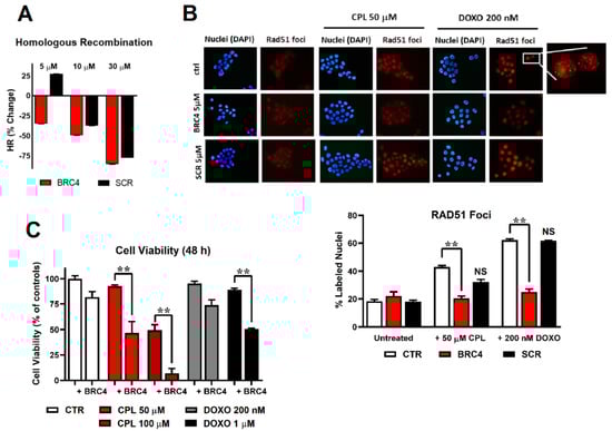 We then used BxPC-3, a pancreatic adenocarcinoma cell line expressing a functional BRCA2 [27]. In its native form, BRC4 was unable to impair HR (Materials and Methods, Section 4.3) due to inefficient cytoplasmic penetration. However, its myristoylated version (BRC4myr: a reducible disulfide links a C-terminal BRC4 Cys with a myristoylated Cys-Lys(Myr)-Lys-Lys-Lys, allowing both membrane permeation and intracellular release) showed a dose-dependent HR inhibition of up to 85.1% at 30 µM with an estimated IC50 ≈ 10 µM (Figure 3A). The localization of RAD51 in BxPC-3 nuclei provided additional evidence for a compromised HR. The large number of nuclear RAD51 foci induced by exposure to 50 µM cisplatin (CPL) or 200 nM doxorubicin (DOXO) virtually disappeared in the presence of 5 μM BRC4myr (Figure 3B). Similar inhibitory HR activity of exogenous BRC4 expression has already been reported in MCF-7 cancer breast cell lines [28].