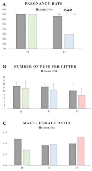 The pregnancy rate in generation F1 was reduced to 30% in the natural uranium (NU) exposed group in comparison with 70% success in the control group (p < 0.05) (Figure 1A). No difference was observed between the successive generations in terms of the number of pups per litter and male/female ratio (Figure 1B,C).