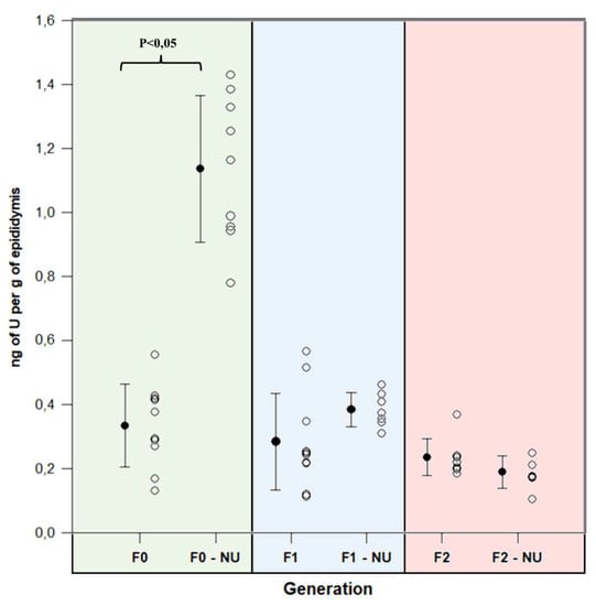 Quantification of uranium in the epididymis for each generation. Significant effects are defined as p < 0.05; n = 7–10 per group.