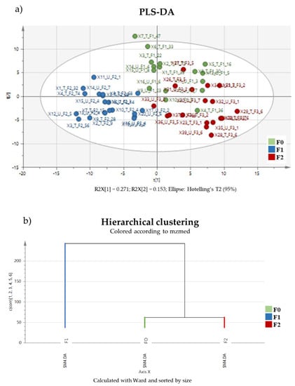 Multivariate statistical analyses were performed using SIMCA-P 14.0 software (Umetrics, Sartorius, France) and partial least squares discriminant analysis (PLS-DA) models were obtained after transforming log 10 [1 + 104] data and Pareto normalization. Model were validated by CV-ANOVA and permutation tests.